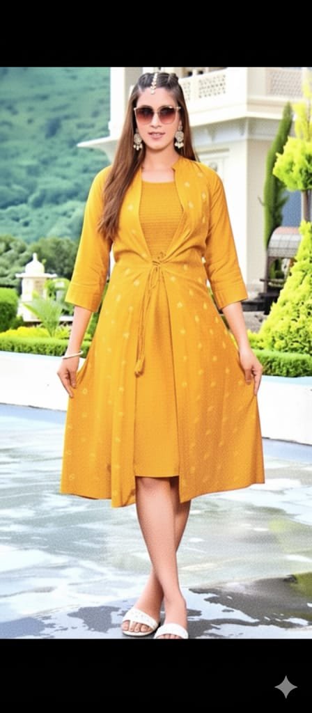 aanchi honey yellow fancy embroidery attach jacket style kurti
