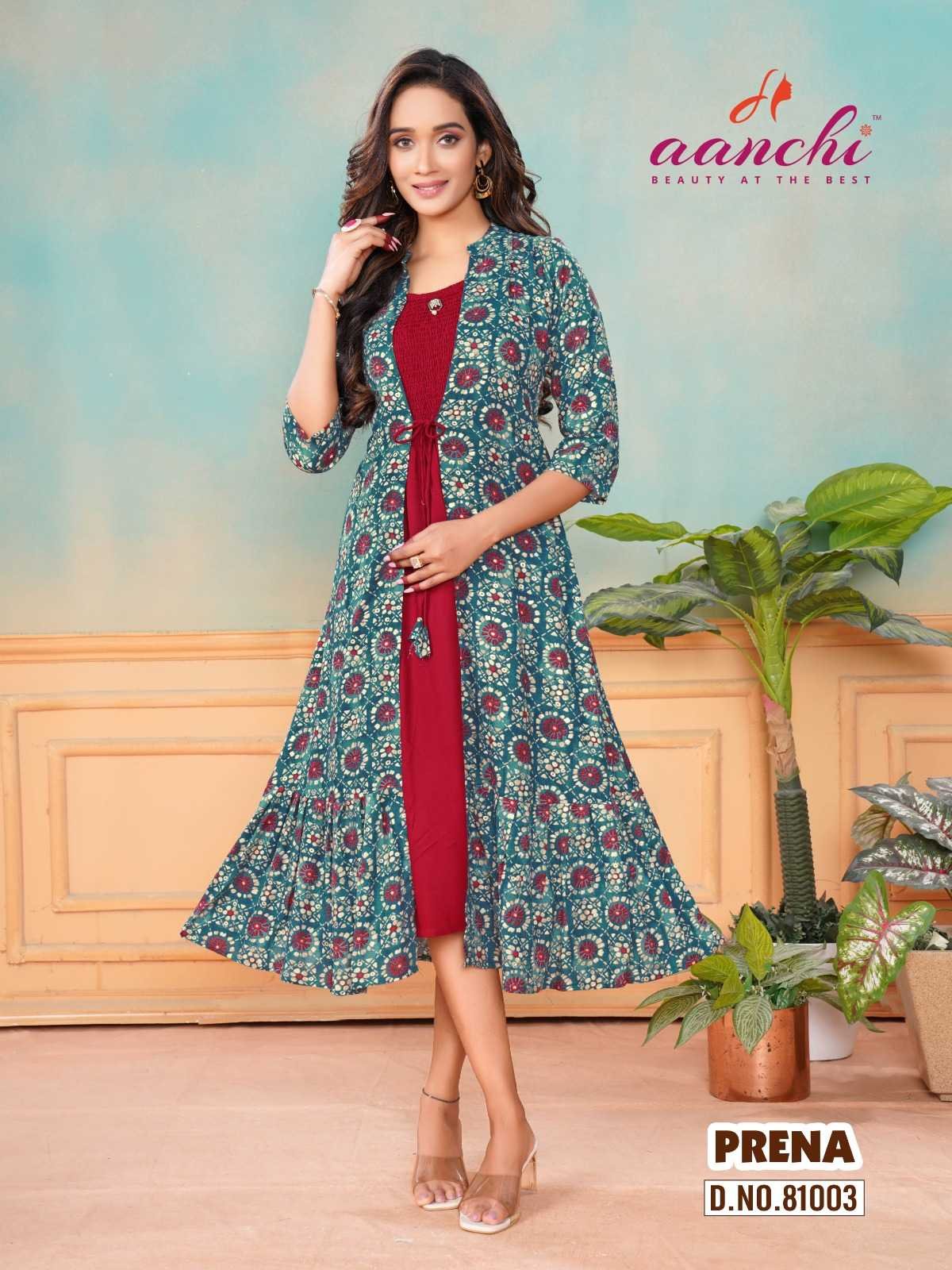 aanchi prena rayon print readymade fancy attach blue jacket style kurti